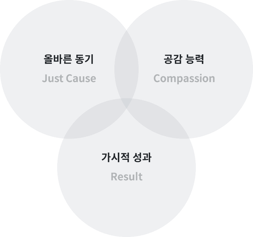 정의롭고 올바른 동기(義)를 기반으로 고객과 동료의 필요에 민감하게 공감(仁)하는 사람들이 모여 가시적 성과(成)를 창출합니다.